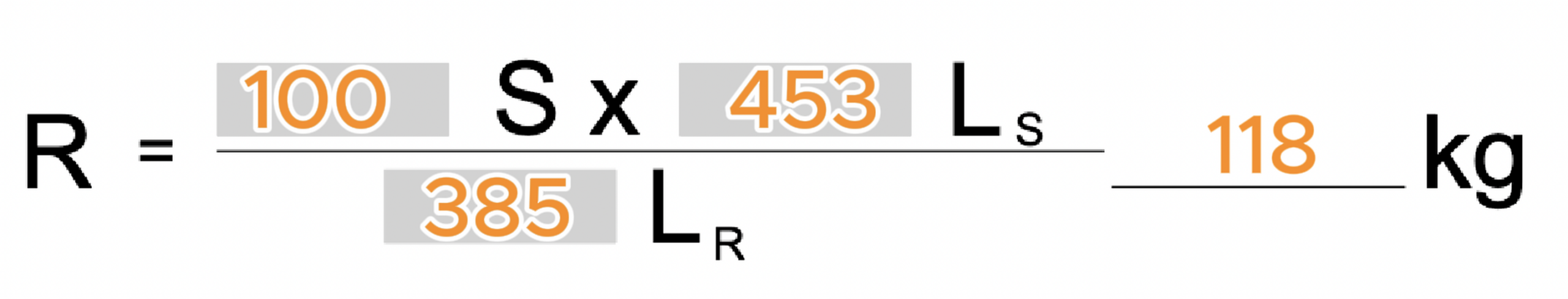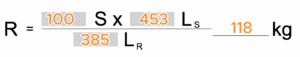 100 (kg) x 453 (cm) / 385 (cm) = 118 (kg) Stützlast