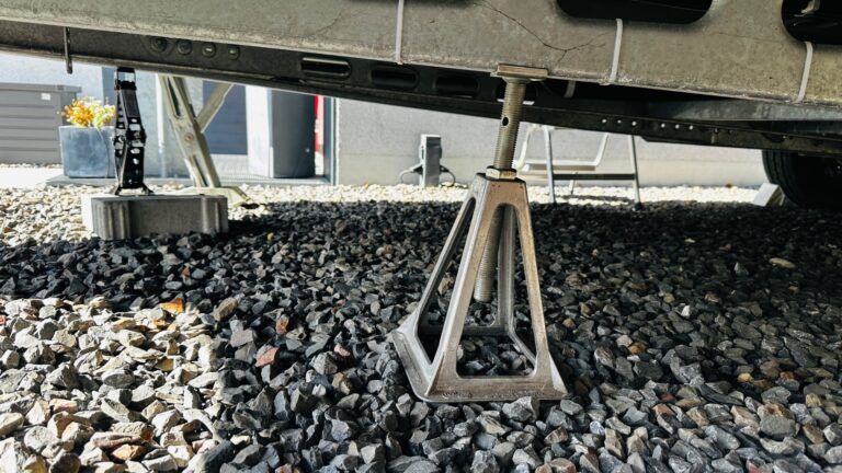 Ein Stützbock zum Unterstellen unter der Deichsel ist ebenfalls sehr ratsam, denn Wagenheber sind nicht für dauerhafte Lasten geeignet und könnten nachgeben.