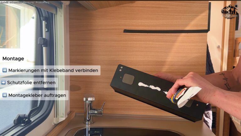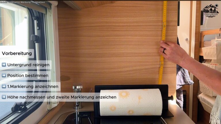 *Ihr könnt, wenn euer Wohnwagen in Waage steht, natürlich auch eine Wasserwage zur Hilfe nehmen, statt die Höhe auszumessen und anzuzuzeichnen – unser ist es leider nicht ganz und bevor ich den Wohnwagen lange nivelliert hätte, habe ich eben rasch per Metermaß von der Arbeitsplatte aus gemessen.